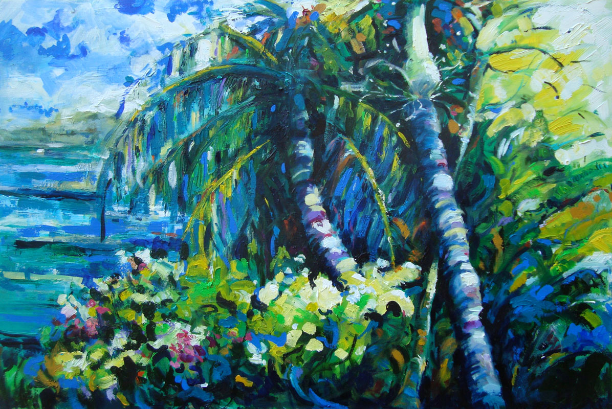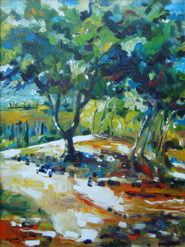 Specifically her acrylic and oil paintings are strong, colourful and textural, capturing the light and colour of the country she is in - Winter Morning Walk (England) | Barrier Reef (Australia) | Sunny Provence (France).