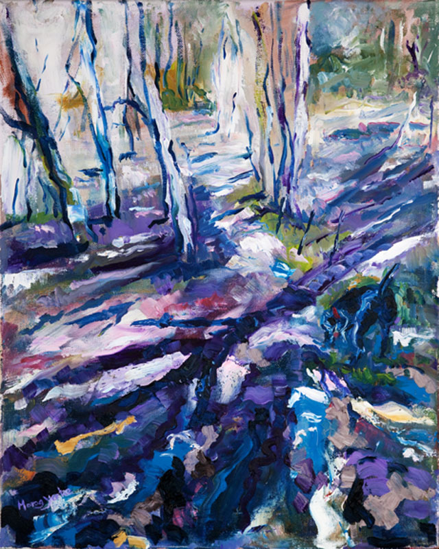 Her unique use of materials and the vibrant colours she uses to express form and light give her a wonderfully individual and fresh style of plein air painting. Working in many materials, oil, acrylic, watercolours, ink, pastels, charcoal, and metallic powder, she loves to experiment with different combinations, which produce new and exciting results.
